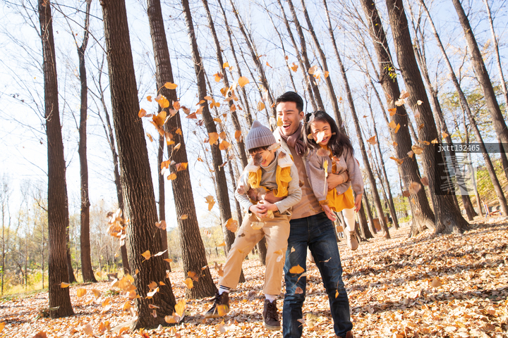 图片标题:     青年父亲带着孩子们在树林里玩耍