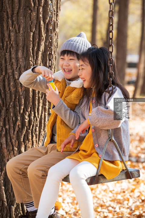 图片标题: 快乐儿童坐在秋千上吹泡泡