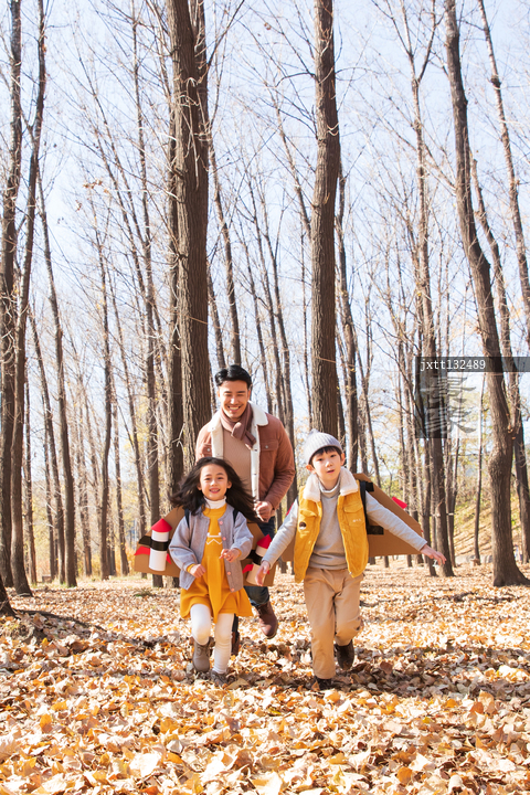 图片标题: 年轻父亲带着孩子们玩飞机游戏