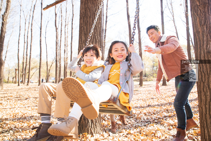 图片标题: 青年父亲推着孩子荡秋千