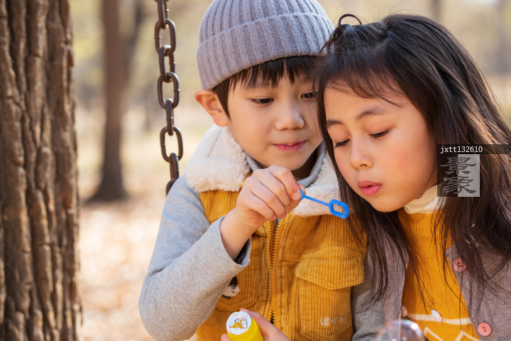 图片标题: 快乐儿童坐在秋千上吹泡泡