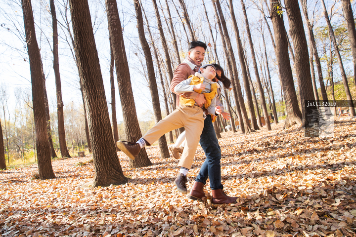 图片标题: 青年父亲带着孩子们在树林里玩耍