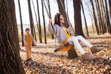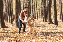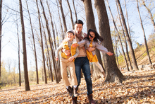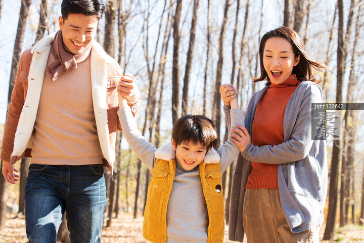 图片标题: 快乐家庭在树林里玩耍