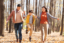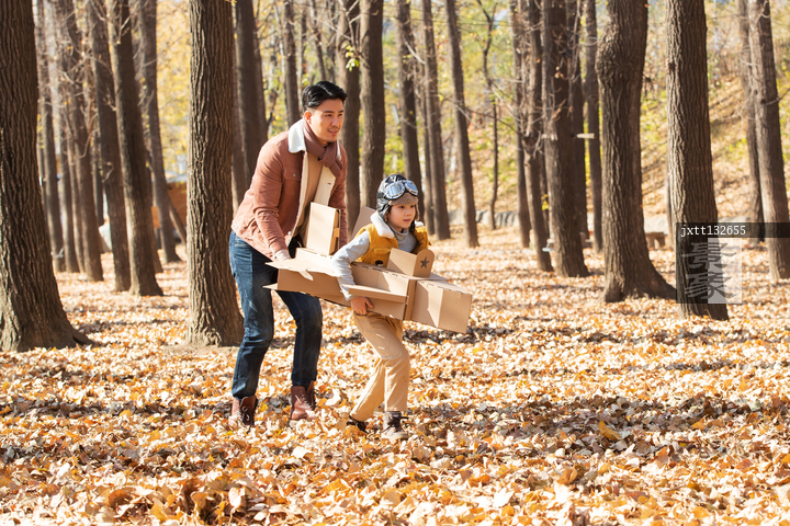 图片标题: 年轻父亲带着孩子玩飞机游戏