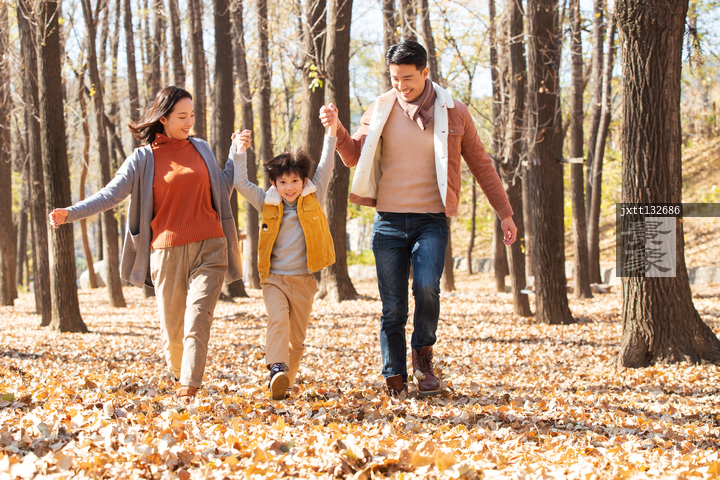 图片标题: 快乐家庭在树林里玩耍