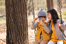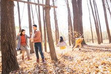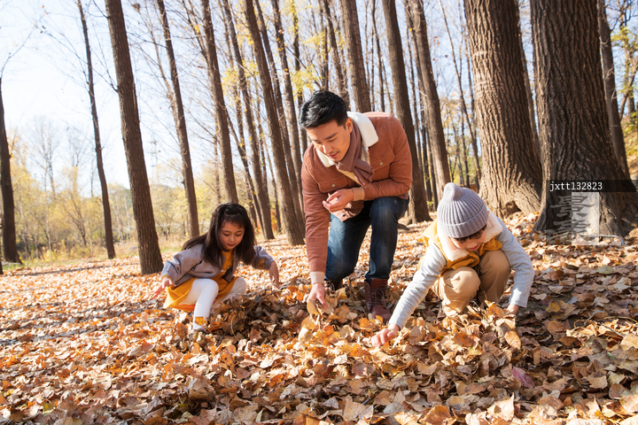 图片标题: 青年父亲带着孩子们在树林里玩耍
