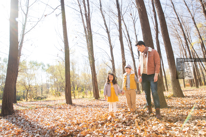 图片标题:     青年父亲带着孩子们在树林里玩耍