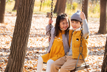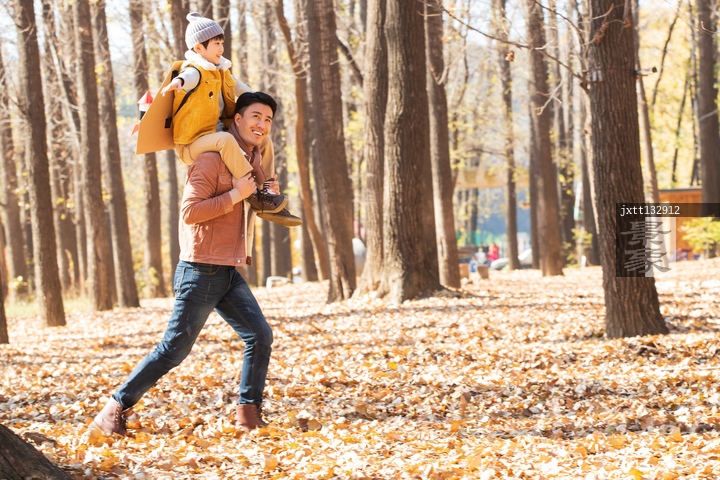 图片标题: 年轻父亲背着孩子玩飞机游戏