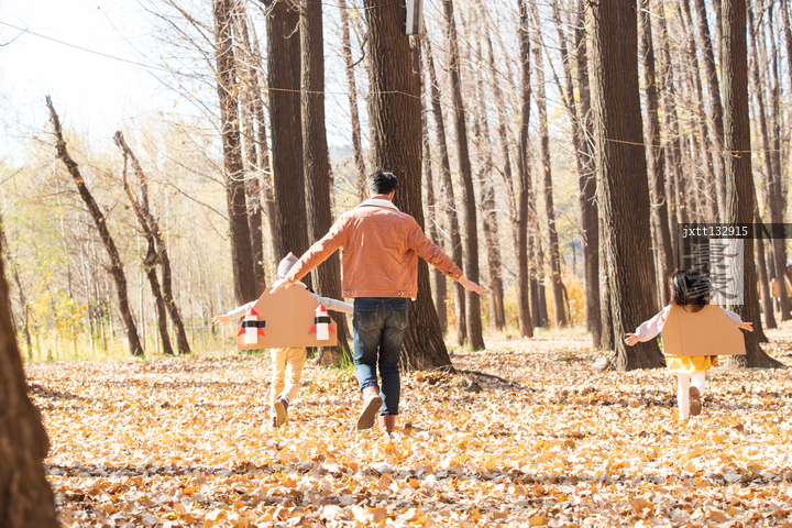 图片标题: 年轻父亲带着孩子们玩飞机游戏