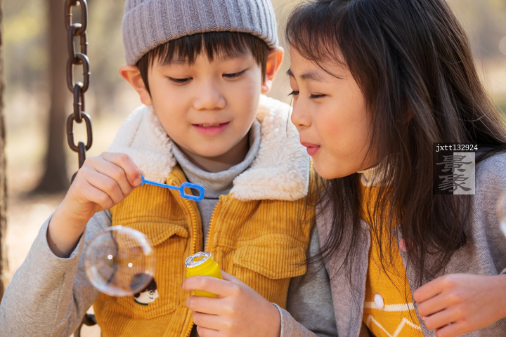 图片标题:     快乐儿童坐在秋千上吹泡泡