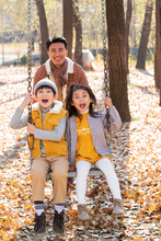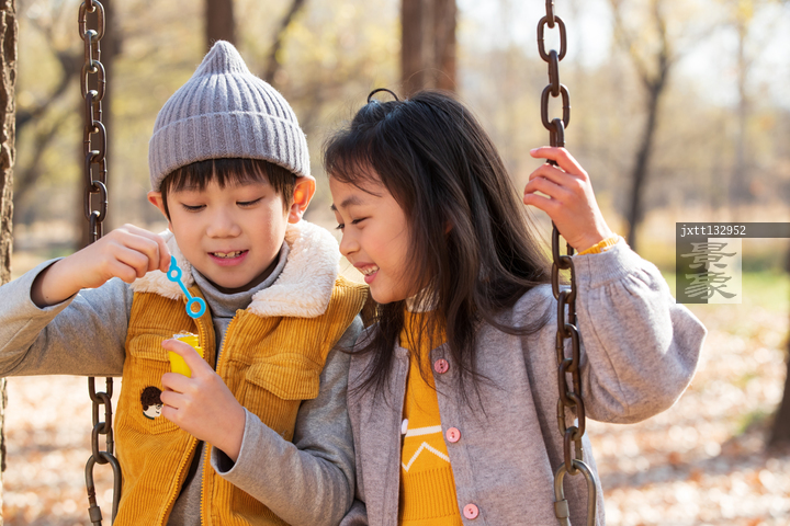 图片标题: 快乐儿童坐在秋千上吹泡泡