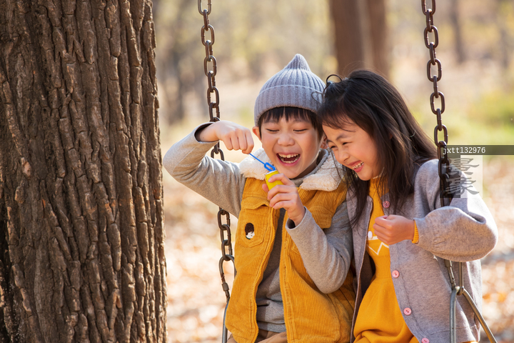 图片标题: 快乐儿童坐在秋千上吹泡泡