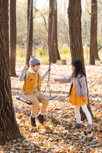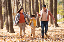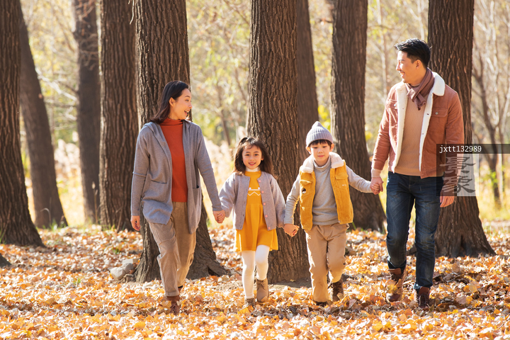 图片标题: 快乐家庭走在树林里