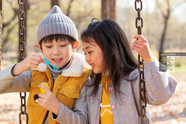 图片标题: 快乐儿童坐在秋千上吹泡泡