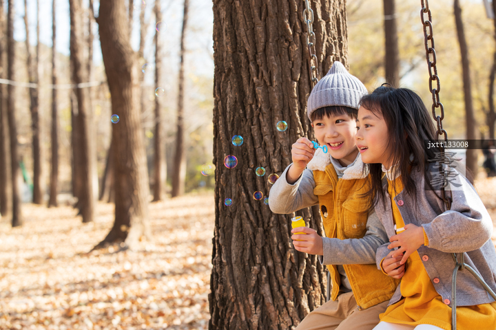 图片标题:     快乐儿童坐在秋千上吹泡泡