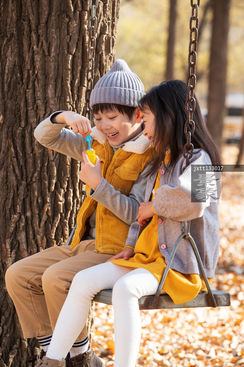 图片标题: 快乐儿童坐在秋千上吹泡泡