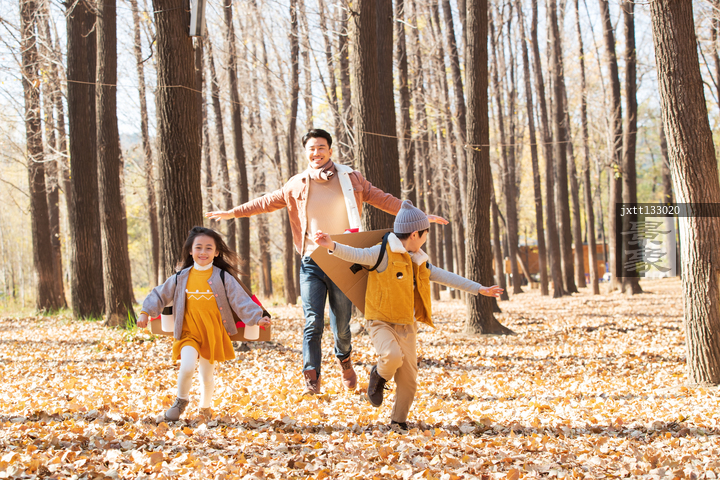 图片标题: 年轻父亲带着孩子们玩飞机游戏
