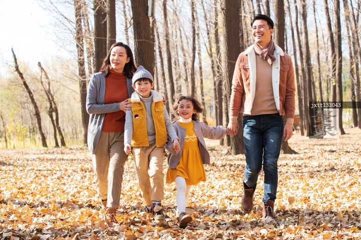 图片标题: 快乐家庭走在树林里