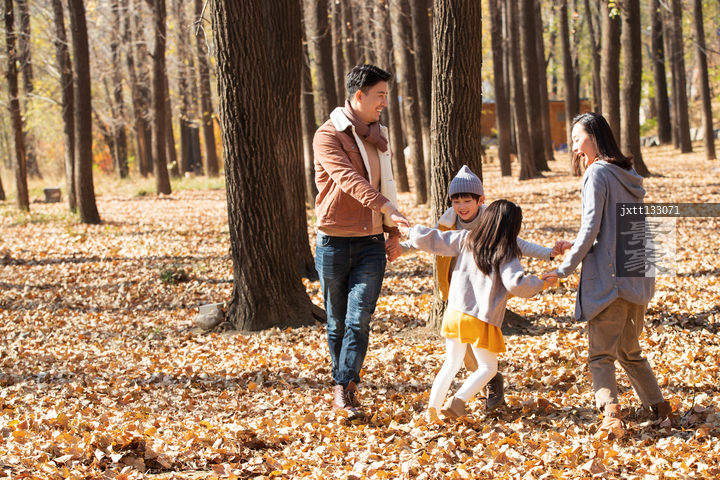 图片标题: 快乐家庭在树林里玩耍