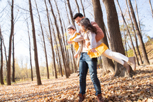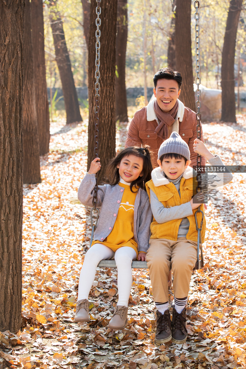 图片标题: 青年父亲推着孩子荡秋千