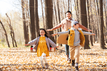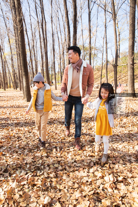 图片标题:     青年父亲带着孩子们在树林里玩耍