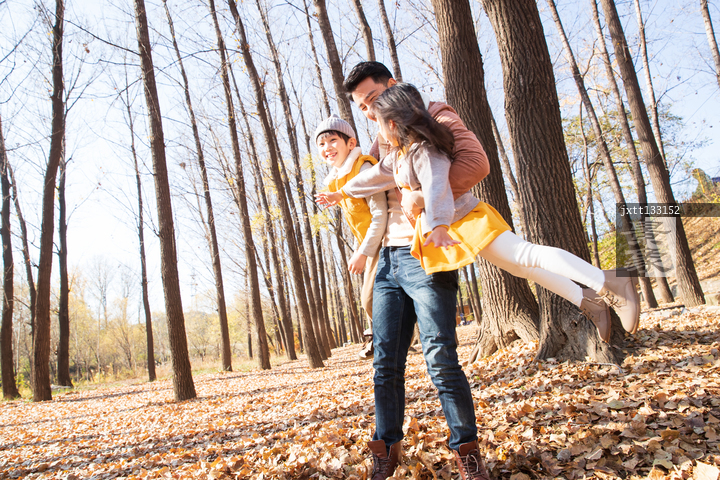图片标题:     青年父亲带着孩子们在树林里玩耍