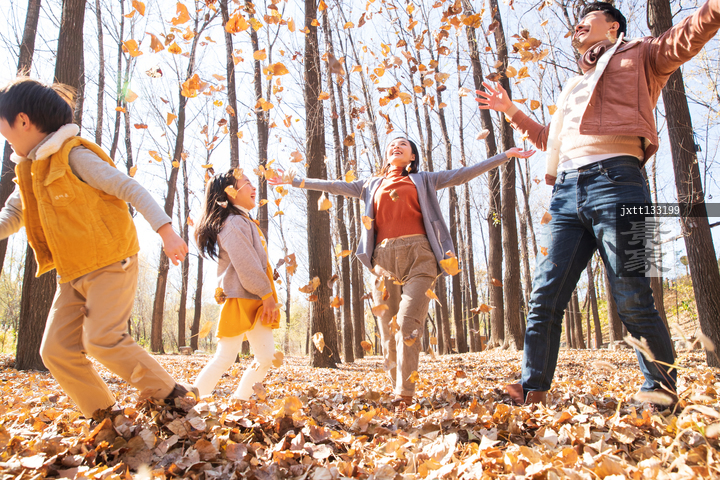 图片标题: 快乐家庭在树林里玩耍