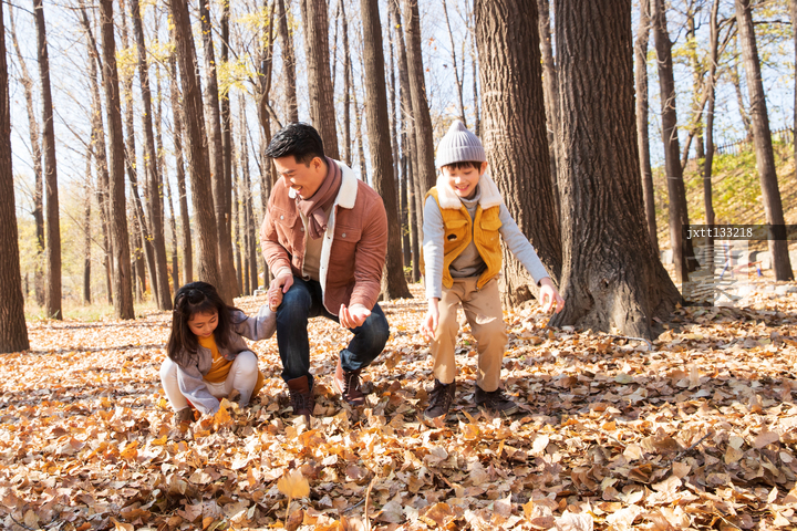 图片标题:     青年父亲带着孩子们在树林里玩耍