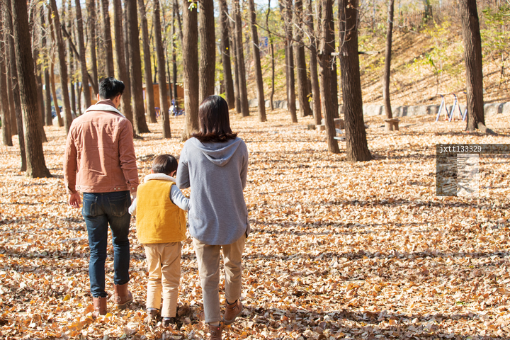 图片标题: 快乐家庭在树林里玩耍