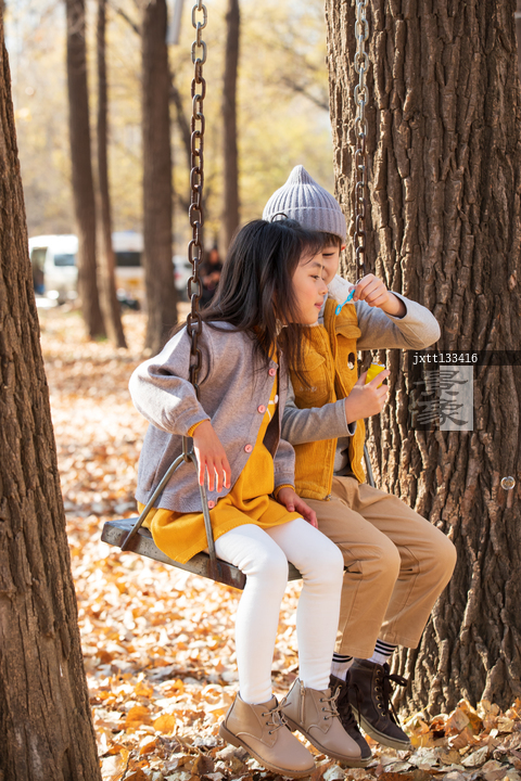 图片标题:     快乐儿童坐在秋千上吹泡泡