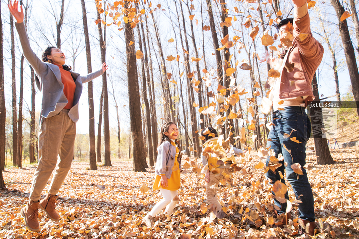 图片标题: 快乐家庭在树林里玩耍
