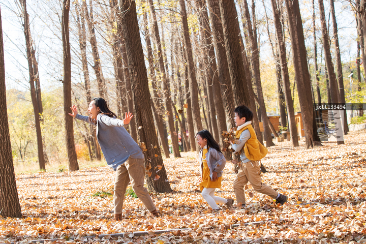 图片标题: 快乐家庭在树林里玩耍