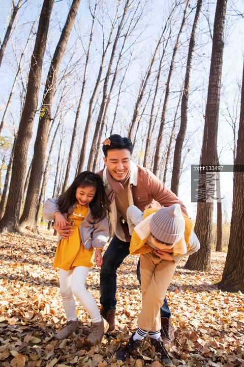 图片标题: 青年父亲带着孩子们在树林里玩耍