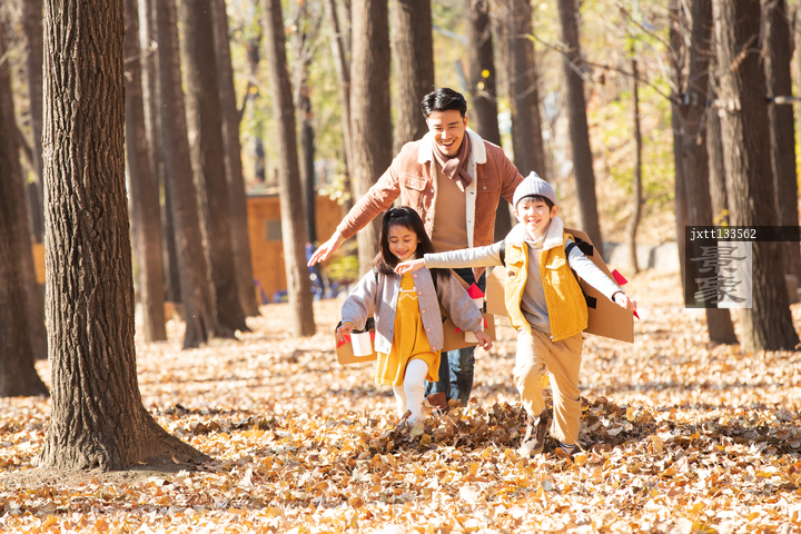 图片标题: 年轻父亲带着孩子们玩飞机游戏