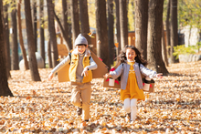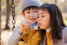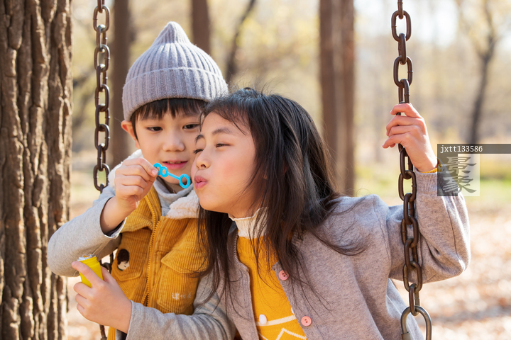 图片标题: 快乐儿童坐在秋千上吹泡泡