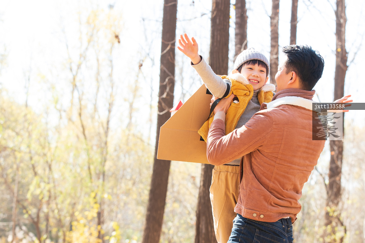 图片标题: 年轻父亲抱着孩子玩飞机游戏