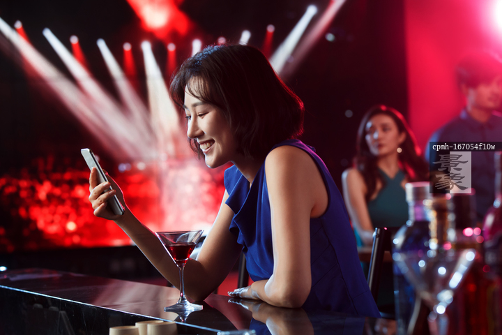 图片标题: 青年女人在酒吧看手机