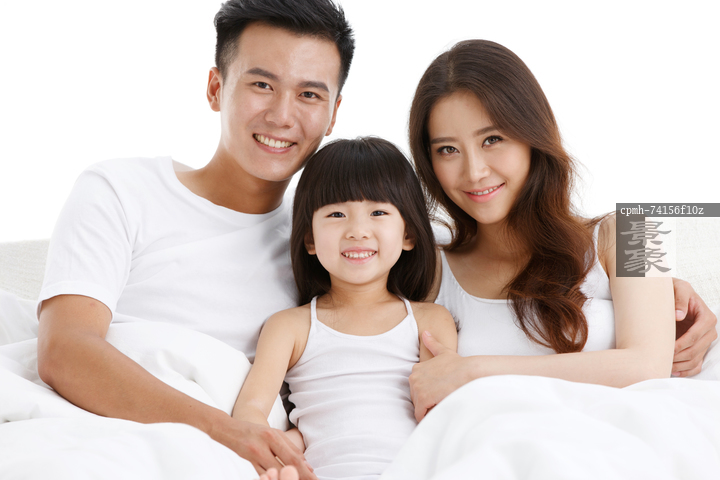 图片标题: 幸福的一家三口在卧室的床上