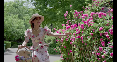 视频标题: 青年美女在开满鲜花的院子里骑自行车