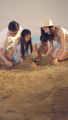 视频标题: 快乐的四口之家在沙滩上跳跃