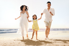 图片标题: 快乐的年轻女性在海边跳跃