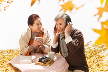 图片标题: 老年夫妇坐着庭院里