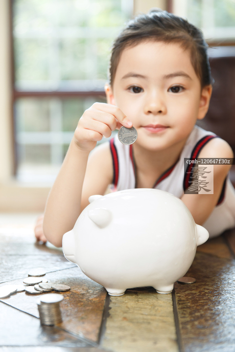 图片标题: 小女孩把钱放入存钱罐
