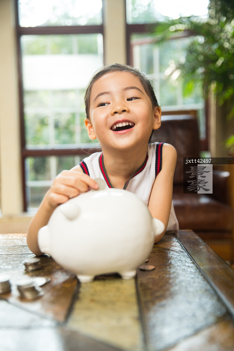 图片标题: 小女孩把钱放入存钱罐