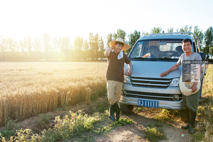 图片标题: 靠在车上的农民