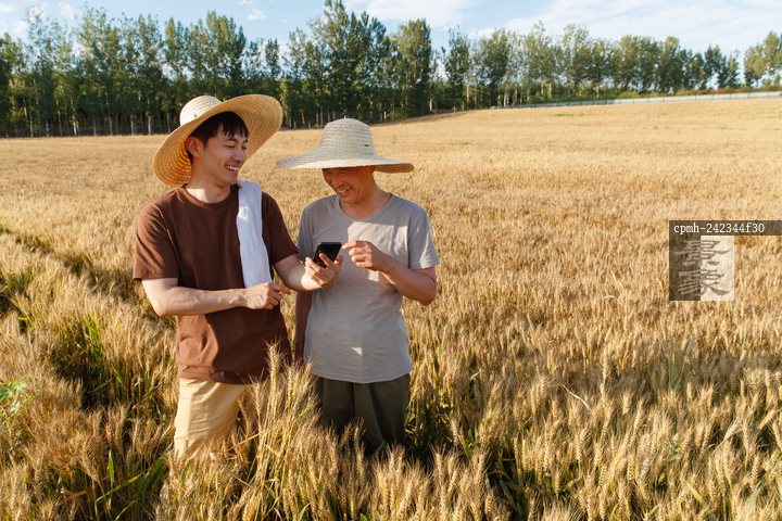 图片标题: 科研人员和农民在麦田里交流技术