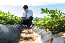 图片标题: 科研人员和农民在麦田里交流技术