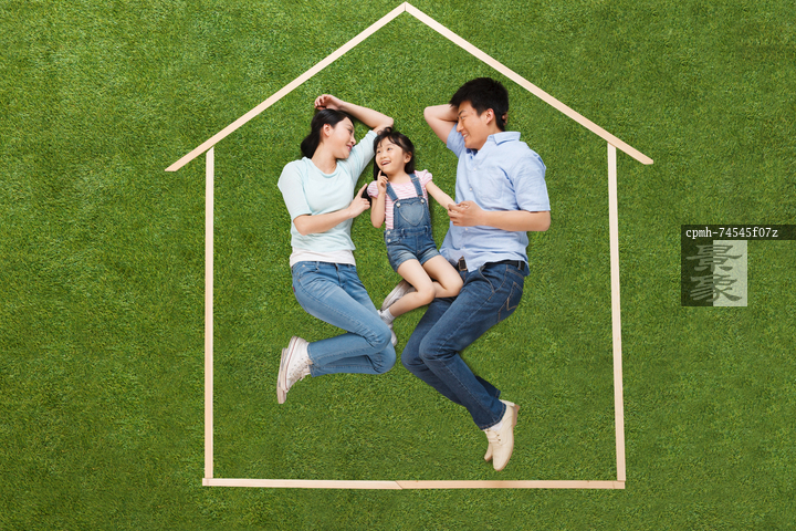 图片标题: 幸福的一家三口躺在草地上的模型房子里