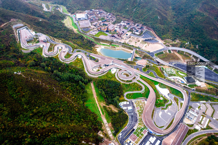 图片标题:     2022北京冬奥会和冬残奥会延庆赛区:国家雪车雪橇中心,无人机航拍,白云从镜头前飘过