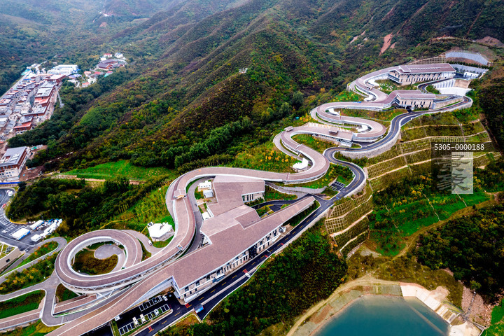 图片标题: 2022北京冬奥会和冬残奥会延庆赛区:国家雪车雪橇中心,无人机航拍,白云从镜头前飘过
